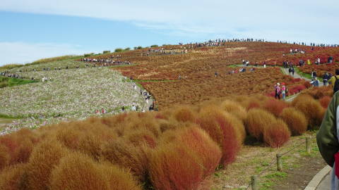 これまで春のネモフィラシーズンしか見たことのなかった、ひたち海浜公園のみはらしの丘です。秋にはコキアで丘が彩られます。 二日連続で訪問しました。入場料は1日券と50円差なので、別々に買うより相当オトクでした。 11月に入って見頃のピークは過ぎたそうですが、コスモスも周辺に映えて、お客さんがたくさん来ていました。 このあと11月4日からはコキアは抜き取られて、来春のネモフィラに向けた整備が始まるそうです。 |