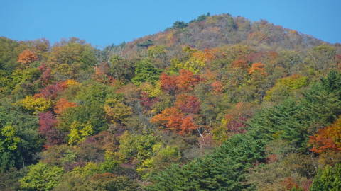 | ウチの北側に見える山にも紅葉が降りてきました。今年の色付きはまあまあでしょうか。 | |