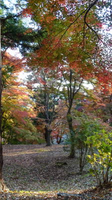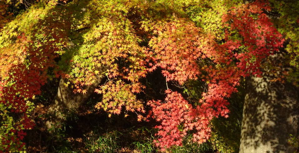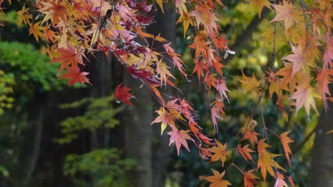 | やはり紅葉はカエデがきれいです。緑から黄緑、黄色、オレンジ、赤までグラデーションとなっていました。 それから奥行きのある庭園では3D写真を撮ってみました。 |