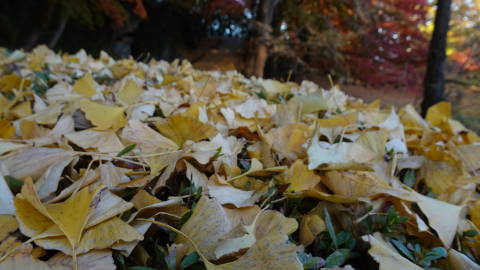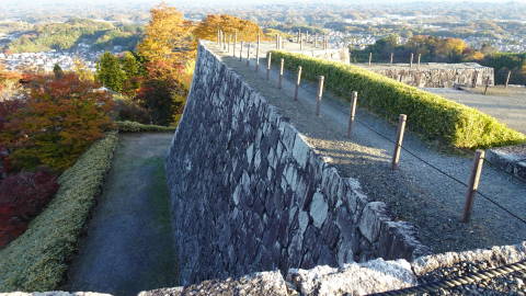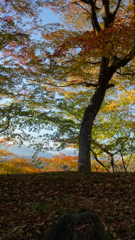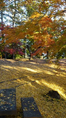 | 天守台(天守閣が建てられていた基礎部分)の上からは360度の眺望が楽しめます。東北のお城(跡)の中でも眺めの良さではトップクラスではないでしょうか。 要因としては立地もありますが、不必要な視界を遮る樹木を野放しにしていないことがあると思います。 また前述のように一部でも上部構造物を復元してあることも好感度を上げています。 銀杏の葉が絨毯のように敷き詰められたところもあります。風が来るとさらに葉が舞いながら落ちてきます。 |
