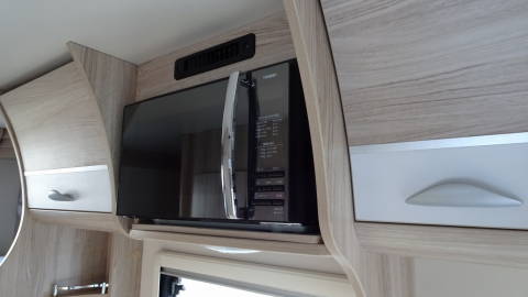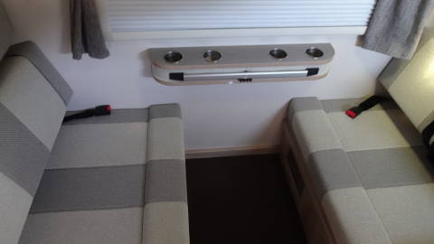 | 各窓には下からのブラインド、上からの防虫網の他に、カーテンも標準で付属します。前車ではカーテンなしで乗っていましたが、やはりあった方が良いけど、取付が面倒で我慢していましたので、良かったです。ちなみにコルド4には標準では付属しません。 窓の開閉方法は、下からの跳ね上げです。 これまでは前半分が横にスライドして開く方式でした。走行中に微開が出来るのは良いのですが、停車時に網戸にする場合などは全長にわたって通気が出来るほうがよいので、最近の車種はこの方式が多くなってきたようです。 |