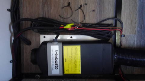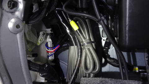 クレソンの場合、増設できそうなスペースは、3列目シートの下しかありません。ほとんど空洞なので何かに使えそうなくらいなのですが、現状はそこにベバストヒーターがあります。そこを避けて設置するのですが、左下写真のように配線を束ねたものがあってやや邪魔でしたので、下写真のように移設しました。 |