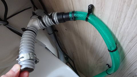| マルチルームです。トイレとしてのマルチルームの必要性は、車種選定の項で記載しましたので省略します。標準ではここには窓も換気扇もありません。ビルダーオプションではあったかもしれませんが、自家工作に回しました。 床の排水パンはオプションで取り付けました。野外活動に係る多様な汚れものも収納するし、トイレも使います。水洗い出来ると安心です。 このほかに大容量排水タンクも取り付けましたが、当初はこの排水パンからは接続されずに垂れ流しになる…という説明でした。納車後に床下を観察したところ、排水ホースはシンクからのものと一緒にきちんと繋がっていました。 |