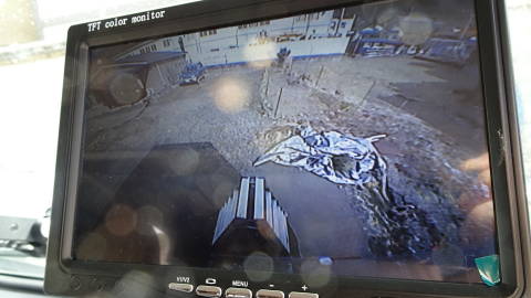 | ミラーによる後方視界の確認と改善です。左写真のモニターのほぼ中央に映っている、右端のの車が、真っ直ぐ後方にある車です。モニターでは広角レンズなのでとても小さくしか見えません。 |