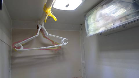 | 上段ベッドです。壁と天井の境で真っ直ぐな平板の木目板は、化粧ベニヤの薄板で、中には配線等が通っていて隠しています。隅にある木材装飾の塊みたいなのは、まだ中に何が入っているのか、それとも機能上必要な強度部材にでもなっているのかわかりません。もし装飾だけであれば取り外す可能性があります。そのすぐ右の四角い白い箱は、後付のサイドオーニングの内側アンカーにカバーをかけたものとのことです。ボディ外板の強度が無いためにこのような工作になっています。 照明は強弱の切替がありますが、強だとLEDですが明る過ぎ、弱だと白熱灯で電気を食いそうです。ここも後日改良予定です。 |