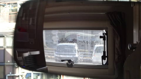 | 車内にある純正のルームミラーが右側です。やや左上にあるミラーは私が補助に取り付けたものです。 コルドバンクスでは後方の窓(下段ベッド)をもっと大きく見ることが出来たのですが、クレソンWでは、少し視野が狭くなり、これまで使っていたフレネルレンズ(凹レンズ)を取り付ける余裕はありません。 純正ミラーでは、調整しても真っ直ぐ後は見えません(下写真)。また鏡面の歪みが気になります。 補助ミラーにより直後方が確認できます(左下写真)。このミラーは吸盤部分をレバー増圧(負圧)機能の付いたものに交換した平面ミラーを使い、ぶれずに確認できます。 これでフェンダー(?)ミラーとあわせて3種類の方法で後方確認がしやすくなりました。 |