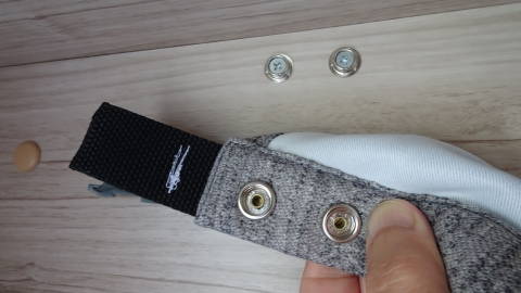 | カーテン側は、差し込みバックルを取り付けたベルトを縫製して結合します。 取り付ける際には、調整で長めにしたバックルをまず差し込みます。 |
