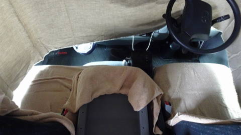 | 次に活用するのは前部キャビンです。キャラバンのロングバンで車中泊を相当数行いましたが、室内容積の限界がキャブコンの現車に較べると小さいので、この部分に就寝時は荷物をほとんど移していました。 これも2人で宿泊する際には使わなくて済むのですが、大人数対策で活用を図ります。 外部から見えないようにカーテンを掛けます。市販品で車種別の断熱マットが売られていて、特に冬などに窓3面に貼っている方が多いのですが、いかにも「泊ってます」的な見栄えと、高価なのと、収納に場所を取りそうなので、あまり好きではありません。 |