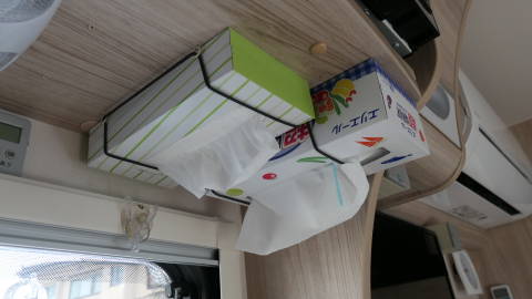 | キャンピングカーの構造要件として、規定人数の就寝スペースが確保される必要があります。ところがその人数いっぱいに寝ようとすると、荷物や着替えなどの置き場所が不足するか、収拾がつかなく位なります。 いつもどおり2人で使うにはノーマル状態で不足は無いのですが、就寝人数が多い場合の、ものの置き場を考えました。 まず活用するのは、普段の2人利用時にはベッド展開しない、ダイニングテーブルの上です。 |