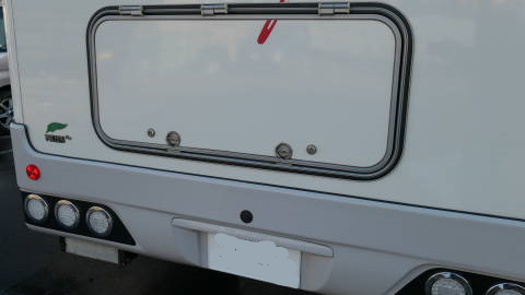 | 左側面の後部バゲッジドアの少し前方にある小さな開口部は、冷蔵庫の排熱開口パネルを取り付ける穴です。冷蔵庫がガス駆動であったころには、上下にパネルが付いていて、特に高温の排気ガスが出ますので絶対に必要な物でした。現在は電気式の物しか販売されていなくなったようですが、その場合にはやけどしない程度の熱が、放熱板から出る程度であり、必ずしもこの開口部は要らないかもしれません。 |