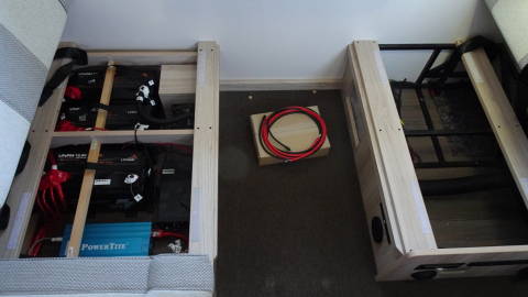 | 二列目クッションの下は三角席から奥の方まで繋がった電気設備設置スペースとなっています。三角スペースの分、他車より配置に余裕があります。また加工改変もしやすくなっています。 | ||