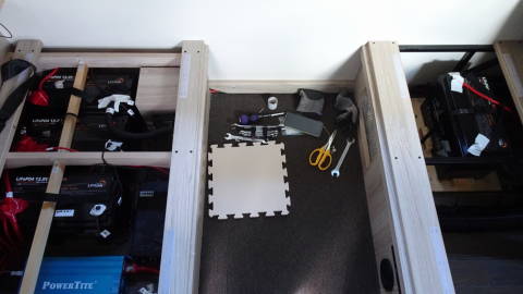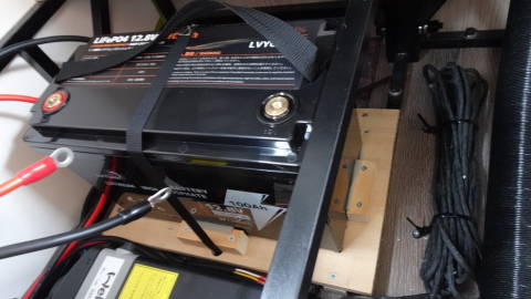サブバッテリーをリン酸鉄リチウムイオン電池に交換してしばらく使ってみました。バッテリー残量計表示が半分以下になっても、電子レンジ等を回した際の電圧降下が小さく済んで、インバーターが落ちることもありません。 ただし。停車時にエンジンを回さず、エアコンを真夏に使いっぱなしするとなると、バッテリー3本では24時間まで持ちそうにありませんでした。そこでLIFEPO4の価格も下がってきたこともあり、4本体制に増設することにしました。日中と夜まで使って、これまで残量が100A程度に減っていたものが、残り200Aもある… ということになればだいぶ安心できます。 |