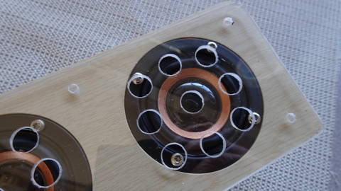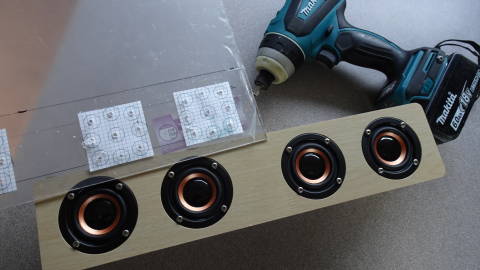 | ボディは木製です。1×4材の半端になったものを集めていた中から取り出して、3段に重ねて、木材用ネジで結合した細長いブロックを作り、その中に木工用ホールソー(インパクトドライバ用)で7個ほど座ぐりします。上記のアダプタに1次側のケーブルをハンダ付けしたものを差し込んで、固定はシリコンシーラントを注入します。2日ほど待てば適度な弾力と固定力を発揮します。 | ||