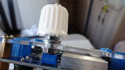 | 回転数を、素手で道具なしで調整するためにツマミを製作加工して取り付けました。材料はイオンのプライベートブランドで売っているドリンクゼリーパックの蓋と、M4のビスとナットです。ビスの先端をサンダーで削って、可変抵抗の溝に差し込んで回せるようにし、高さはナットを重ねて調整し、何とかうまく操作できるようにしました。 | ||