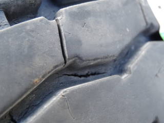 | オールシーズンタイヤは、ブロックパターンで溝が深いため、溝の底は開閉して変形が激しく、ヒビが発生しやすい状況にはあるようです。同種の前のタイヤでもヒビが目立ちました。 振り返って、パンクする2日ほど前でしょうか、田舎の舗装路で緩い下りの直線路を走っている時に、何か左右に細かい振られる感じが、お尻から伝わってきました。車体の挙動が体に伝わってくるのは、手とお尻ですが、お尻の方が敏感な気がします。その時は下車して点検したのですが、目視と手で触れた温度には異常は感じられませんでした。でもこの揺れは前兆であったものと思われます。 |