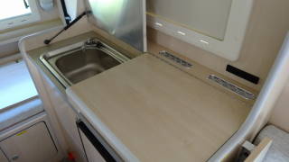 | 次にキャンピングカーであるための必須条件である炊事設備ですが、シンクとガスコンロがステンレスの1枚で成型した構造になり、フタが付きました。使わない時にはフタをして物を置けるのですが、反面開いた時に窓がふさがれてじゃまです。 結局シンク部分のフタは撤去したままとして使用することにしました。これだと歯磨き洗面などの際に物を置くことができるし、手を洗うことはすぐにできます。 |