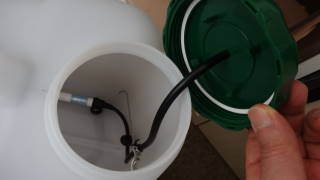 | 左が改良後ですが、右へ伸びるホースの先に普段使う蛇口が付いています。水は低いところに溜まりますので、最下部から水抜きをするようにありあわせの蛇口を付けました。ついでに出口にはタケノコでホースを繋いで、排水受けに導きます。さらにホースを繋いで想定される使い方としては、車外においた給水容器に吸水ホースを差し入れて、ポンプで水を吸い上げて、ここから排出して車内の給水タンクに補充する…といったことも可能になります。 まだ出先で給水補充したことはないのですが、車内の容器にスマートに補充するのには役立ちそうです。 |