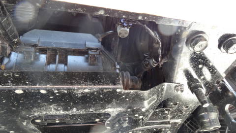 | ↓さらに奥を見ると、ありました。写真中央から少しだけ右上です。 | ↓ バンパーの裏側を見上げると | |