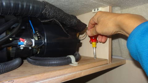 | 器具を取り外した後のスペースは寝具等を収納する棚に使います。一部の冷媒ホースとカプラ付きケーブルが残りますが、あまり邪魔でもないので、この状態で完了にします。 棚板の右の縦板は、取り外せれば有効スペースが増えるのですが、棚板を天井から吊るための強度部材のようですので残します。このあと閉止板から外したモールで合板断面を隠しておきます。 この棚板は、無ければ、車体の傾斜が右上がりの時にも、枕を右側に持ってきて寝るといった使い方もできます。でも、これまでの経験でどうしても左が低くなって寝られないというケースは無かったので、右側固定で残すことにしました。 |