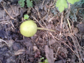 帰り道、道端の木の下には、くるみの実がたくさん(RO)。 帰って夕食に収穫物をありがたくいただきました。