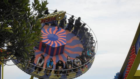 | 春に来た時に乗ってみたい! と狙っていた「ディスクオー」に挑戦です。動画でないとわからないのですが、円盤が回転しながら上向きの円弧の上を往復します。 他の方の撮影ですがこちらに動画があります。 遊具には年齢や身長制限があり、小学生以上や120cmといったものがほとんど。 さらに…上限年齢が設定されているものが3種類。 この秋も楽しくすごせました。 |