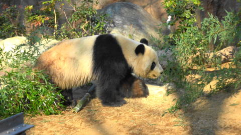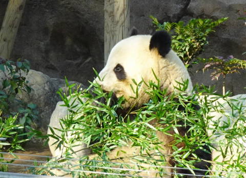 | あてにしないで園内を進むと、パンダ見学の待ち時間は30分で最後尾はこちらとの看板がありましたので、それくらいならいいかということで並んでみました。 見学できるパンダは雌雄2頭いて、それぞれ屋内と屋外の展示場所があって、パンダは出たり入ったりしています。見学者は長い列を10人くらいに区切って、一区切り1分間で進みます。タイミングが悪いと1分間しか見られませんが、外に出てると2〜3区切りから見られます。私たちは合計5区切りくらい(5分間))見られてラッキーでした! |