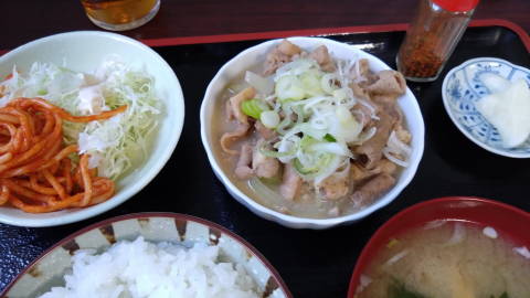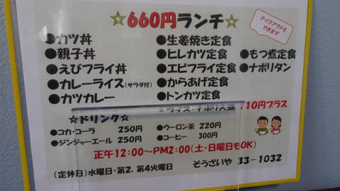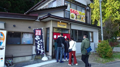 | 人面魚のいる池も見学しますが、すれ違ったおじさんに聞くと、この辺りも熊が出るということで、人面魚だけ観察して戻ってくると… さっきまで閉まっていた食堂が開いていて、おなかも減ってきたので入ってみました。「12時から」になっていましたが、11時半で先のお客さんが入っていました。驚くべきはその価格と味とボリュームがアンバランスなこと! 今時カツカレーやもつ煮定食が一律でこの値段です。 |