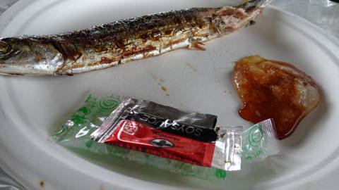 | 醤油味と塩味では、牛肉と豚肉の違いもありますが、醤油味の方が旨く感じました。さんまはおろし大根と醤油も付いてきて、丸焼きでワタも入っています。ワタも脂分でおいしいのですが、胃袋の辺りまで食べるとウロコも入っていることが多いので気を付けて、おいしくいただきました。 | |