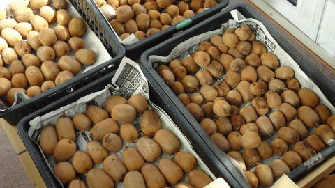 今年も秋の収穫で、カキの実をもらって(採取させていただいて)皮をむいて干し柿を作り始めました。 それからキウイも霜が二回降ってしまいましたので摘みました。葉がまだ残っていましたので霜の被害はまだ大丈夫かな? 昨年は不作で70個ほどしか採れませんでしたが、今年は600個行けました。ほぼ一本の木から成るのですが過去最高とタイ記録ぐらいです。 |