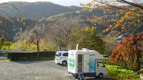 | 西側の歩道コースを登ってゆきます。池や独立した社を眺めながら行くと、安達太良連峰を望むところに出ます。車でも上がってこられるのですが、やはり城跡や公園は歩くに限ります。キャンピングカーみたいな車が止まっていましたが、これはトイレカーで、仮設トイレとして配置されているようです。トラックの荷台に載せるタイプにすれば、各自治体の有力な災害対策にもなると思います。 | |
