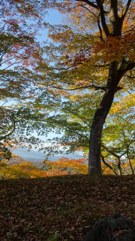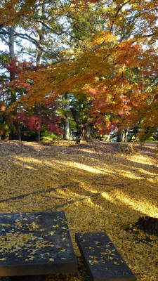 | 天守台(天守閣が建てられていた基礎部分)の上からは360度の眺望が楽しめます。東北のお城(跡)の中でも眺めの良さではトップクラスではないでしょうか。 要因としては立地もありますが、不必要な視界を遮る樹木を野放しにしていないことがあると思います。 また前述のように一部でも上部構造物を復元してあることも好感度を上げています。 銀杏の葉が絨毯のように敷き詰められたところもあります。風が来るとさらに葉が舞いながら落ちてきます。 |