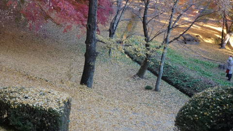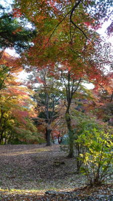 | やはり紅葉はカエデがきれいです。緑から黄緑、黄色、オレンジ、赤までグラデーションとなっていました。 それから奥行きのある庭園では3D写真を撮ってみました。 |