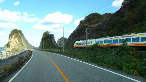翌日は、山形県米沢市へ出て、米坂線沿いにさらに日本海へ、笹川流れを通って、鶴岡市の善宝寺を昨年に引き続き向かいました。R7の海沿いでは羽越線の特急?や