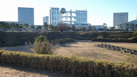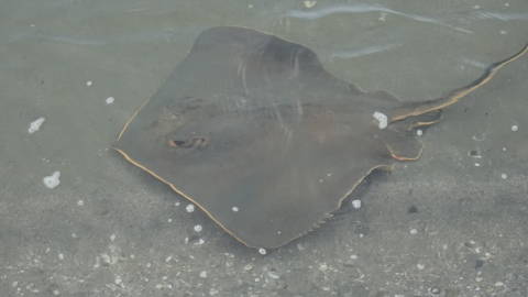 | 朝の散歩では、この時点で話題を集めているフジテレビも望めます。お台場の遺跡や波打ち際や松林と、東京とは思われない閑静な環境です。 浜辺を進むと、なんと!孫がエイを見つけました。人影を見ても逃げないどころか、水の中を付いてきて手が届きそうなところまでも時々来ます。誰かに餌付けされたのかもしれません。 |