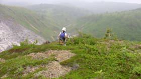 | 帰りはベコ谷地経由で後生掛温泉に戻ります。初めてこの温泉にたどり着いた時のようすは活字化されていますのでサイト内をご覧ください。その時は逆周りでした。 前回の通過から5年近くを経過して、その間に刈り払いが無かったものと思われます。道は笹薮に覆われていました。掻き分けながら進みます。時々前を行くパートナーを見失いそうになります。 ★その後秋田県自然保護課にお尋ねしたところでは2008年8月下旬に地元の方の手でこのコースの刈り払いを予定しているとのことでした。これでまた来ることができます。ありがとうございます。 |