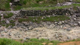 前方谷底に目指す温泉が見えてきました。ここからやや急な尾根の下りになります。ガンコウランに登山道(旧作業道)は覆われそうになっています。ここでは人が通って「踏み荒らす」よりも植生の回復速度のほうが勝っているようです。それだけこの道を通る人が減ってきているのでしょうか。 谷底には人工物の石垣が築いてあります。ここではどんな仕事をしていたのでしょうか。 |