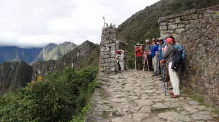 | インカ道の峠になっているインティプンクの逆側から、何日間かの歩行ツアーで上ってきた日本人一行十数人の人たちにちょうど出会いました。体力と時間(とお金がもっと)があればこれも楽しそうです。 動画;昼食のあとインティプンクへミニトレッキング ↓このコースで唯一階段のあるところ。他は石畳のみち。後方はマチュピチュ遺跡 |