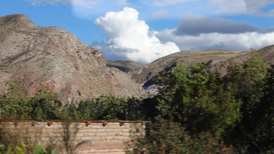 | この川沿いには車道は無くて、交通機関は鉄道だけです。でも馬が通れるくらいの道も並行して向こう岸にみえます。(動画にあります) それからインカ道が山間を通ってマチュピチュまで繋がっています。日本からもこのトレッキングコースを歩きにやってくる人たちもいます。(既述) 遠くの山々はアンデスの高山に繋がっていますので雪をいただいたところもあります。 車内からの眺めはこちらから動画をご覧ください。 |