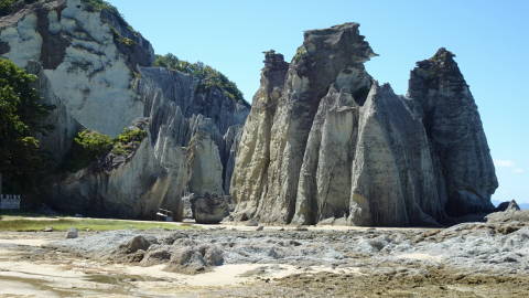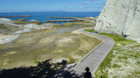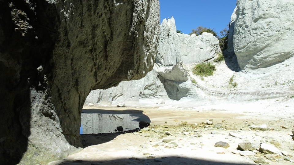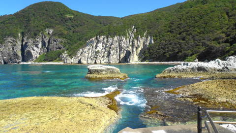 | 波の穏やかな海と岩場の間を縫うように歩道を進んで行くと、三陸沿岸ではあまり見られない白い岩の上に青い水が揺らめいて、ナマズに似た魚がゆったり泳いでいたりします。 | ||