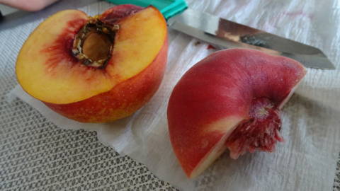 | 最近岩手から青森に向かう国道4号を通る際に立ち寄るのが、名川チェリーセンターです。季節によって名称のサクランボだけでなく各種果物や野菜が並びます。 写真はネクタリン(左)と、名称を忘れた桃です。前者は少し規格外ですがものすごい安さと美味しさ。後者は写真の撮り方が悪くて普通の桃に見えるのですが、軸の部分を圧縮して、断面が無限記号∞のような形をしています。たしか北限の桃は鹿角あたりだと思ったのですが、この品種は青森でも採れるようです。 |