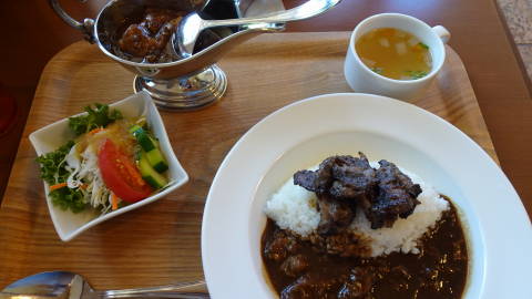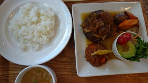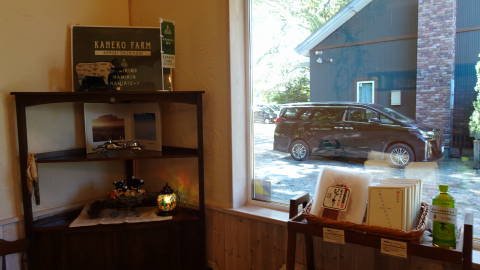 | 牧場の中にあるレストラン 牧場ごはんNARABI で昼食をいただきます。店内にKANEKO FARM の説明があって直営店のようです。 | ||