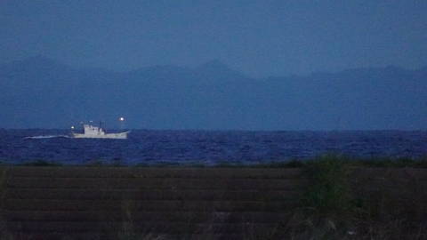| 大間崎の朝は未明から次々に出港してゆく漁船からエンジンのうなりが届く所から始まります。もちろん乗っている方々はそれよりずーっと早起きです。 ←向こうの山並みは北海道 |