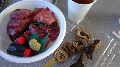 | 開店時刻の8時になっても戻ってきません。5分過ぎ頃に車でおかみさんと従業員?家族?がやってきて接客を始めました。他の野菜やおかずも食べたいのでテイクアウトでマグロ丼2,500円(他のお店はもーっと高額)と、胃袋と心臓の串焼き(各300円)を注文して車内でいただきます。胃袋はマンボウの同と似た感覚でいただけましたが、心臓の方は私的には無理でした。 | ||