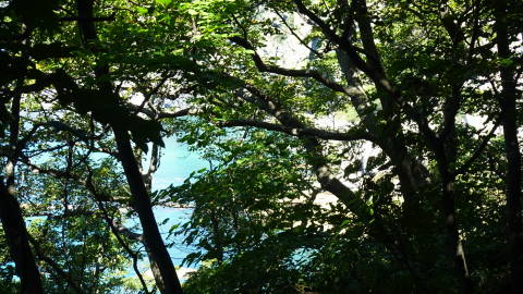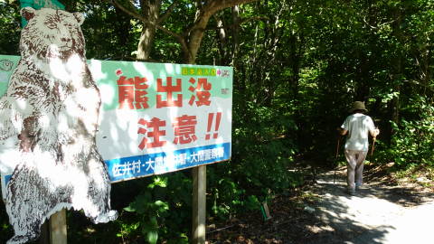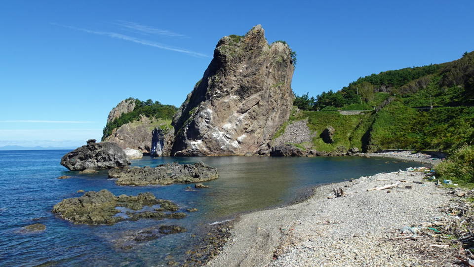 | 所々改良されて全面舗装になってはいますが、まだまだ曲がりくねった道を進んでゆくと仏が浦に出ます。とはいっても陸路からのアプローチで仏が浦の奇岩を間近で眺めに行くためには、標高差110m程の坂道を往復する必要があります。 駐車場にはトイレがあって、あまりやってくるお客さんは多くありません。熊注意の看板がありますので、鈴と熊スプレー持参で向かいます。坂の入口近くに売店跡もありますが、この先は浜辺にトイレと船着き場があるのみです。 |
