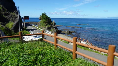| 海峡ライン沿いに南下します。願掛岩という巨大な岩壁があるのですが、半世紀前に初めてここに来た時にもここで写真を撮りました。その頃は道路は未舗装の1.5車線でホコリだらけ、延々と続く悪路に辟易として、歩いていた大きなかごを背負ったおばあちゃんに、ここは何という所ですか?と訪ねたら「長後」ということでした。今のようにナビで残り距離や位置がわかるわけでなく、先を断念して大間へ戻ったのでした。 | ||