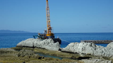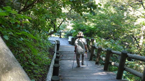 | 標高を下げて行くとなだらかな土の道は木製の階段になり、木々の間から眺望が開けてきます。 船着き場まで木製歩道が延びています。この日は何やら消波ブロックで着岸を容易にすることに関連した工事をやっていたようです。 |