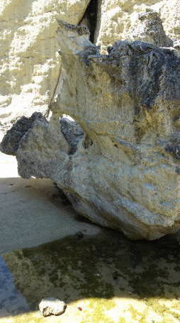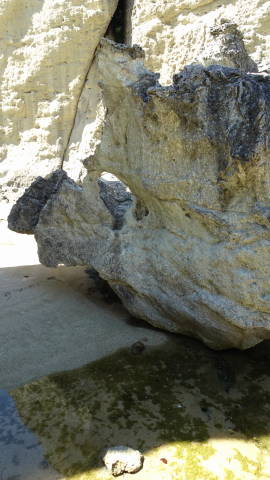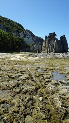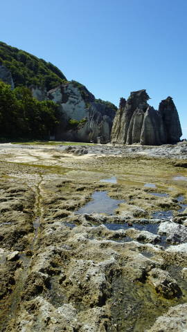 | 満潮時には歩けなくなる平らな岩盤の上を奇岩を縫って散策出来ます。 | ||
