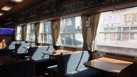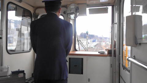 | 編成は一両完結タイプで、前後に運転席と料金システムがあり、トイレもあります。車両の中央寄りは対面ボックス席で前後出入り口付近はベンチシートです。(右写真) この列車ではたまたま新人運転士?と指導員の方の二人体制での運行でした。経路上各所でのスピードコントロールや注意事項を細やかに指導しています。(右下写真)) |