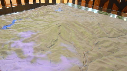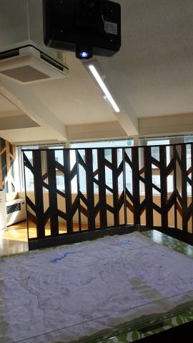 駅舎二階には森吉山などの紹介コーナーと休憩所があります。最近の展示は、立体地図に上方からプロジェクションマッピングで各種情報を紹介するものが多いのですが、こちらにも取り入れられています。 ←左写真 上方の黒いのがプロジェクター 下が立体地図 |