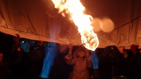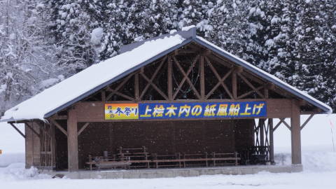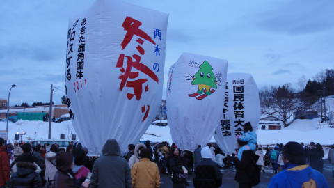 | 2011年の2月11日、車で当地にやってきました。途中 大覚野峠がカーブと積雪の難所で、途中で除雪車を追い越したりします。 その峠の手前に上桧木内の集落があり、そこでは毎年紙風船(熱気球)が夜空に舞い上がるイベントが行われます。 右と下 計4枚の写真はその時(2011)のものです。 |